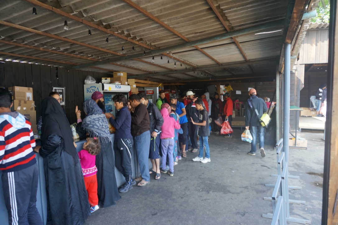 The Centre is full, mostly with young men, but also women, whole families with children. The concentration is toward the middle where you can charge your mobile phone and since there is free-Wi-Fi, many are standing in line to get their phones charged. They call home, they call smugglers, they check different routes and different holes in the Hungarian boarder where they can pass. They are Afghans, Iraqis, Syrians, and some of them Pakistanis. Almost everyone I talk to wants to come to Sweden.